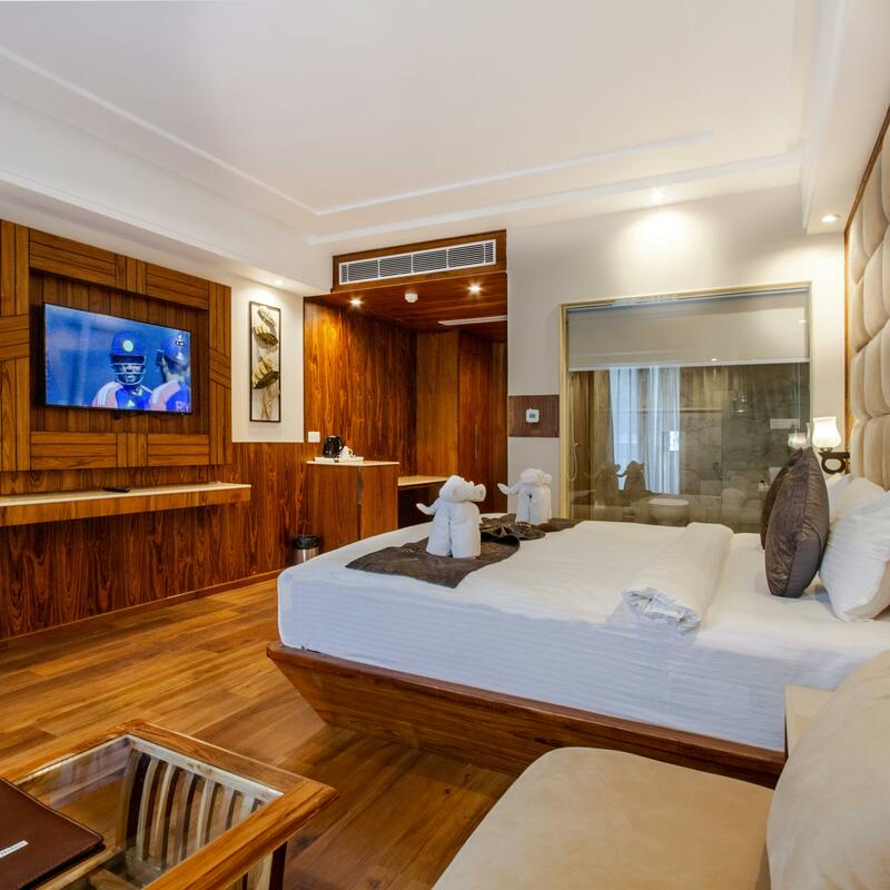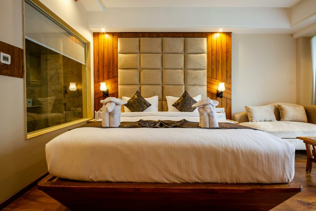 Our Luxury Suite offers stunning views, plush furnishings, and a spacious layout to provide the ultimate relaxation experience. Perfect for those seeking a lavish stay, complete with custom curtains and blinds that enhance the ambience. Price: $250 per night. == Image Ids: [2132532, 2132529, 2132517, 2132520, 2132523]